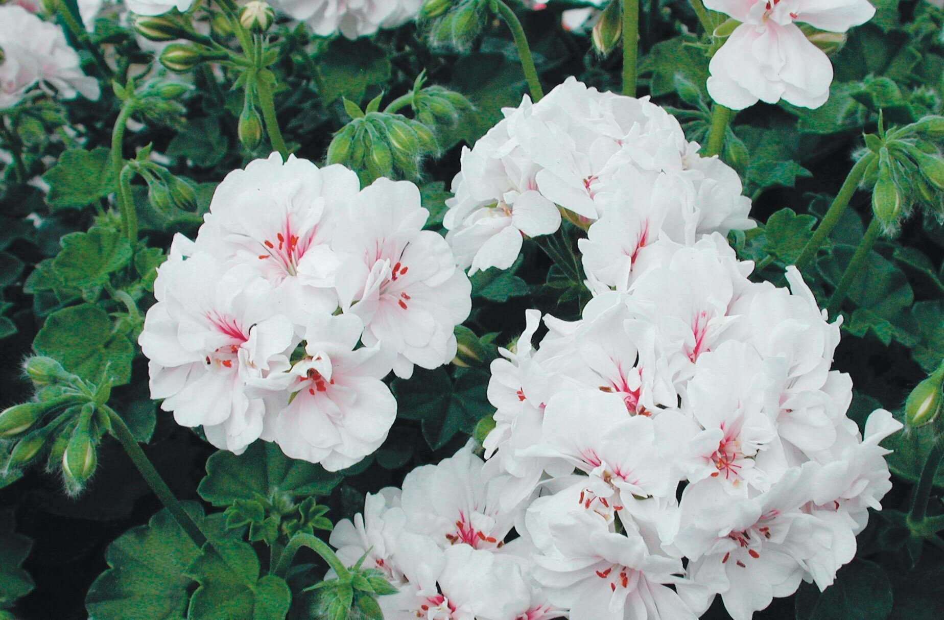 - A trailing geranium with white flowers with an attractive pink centre
