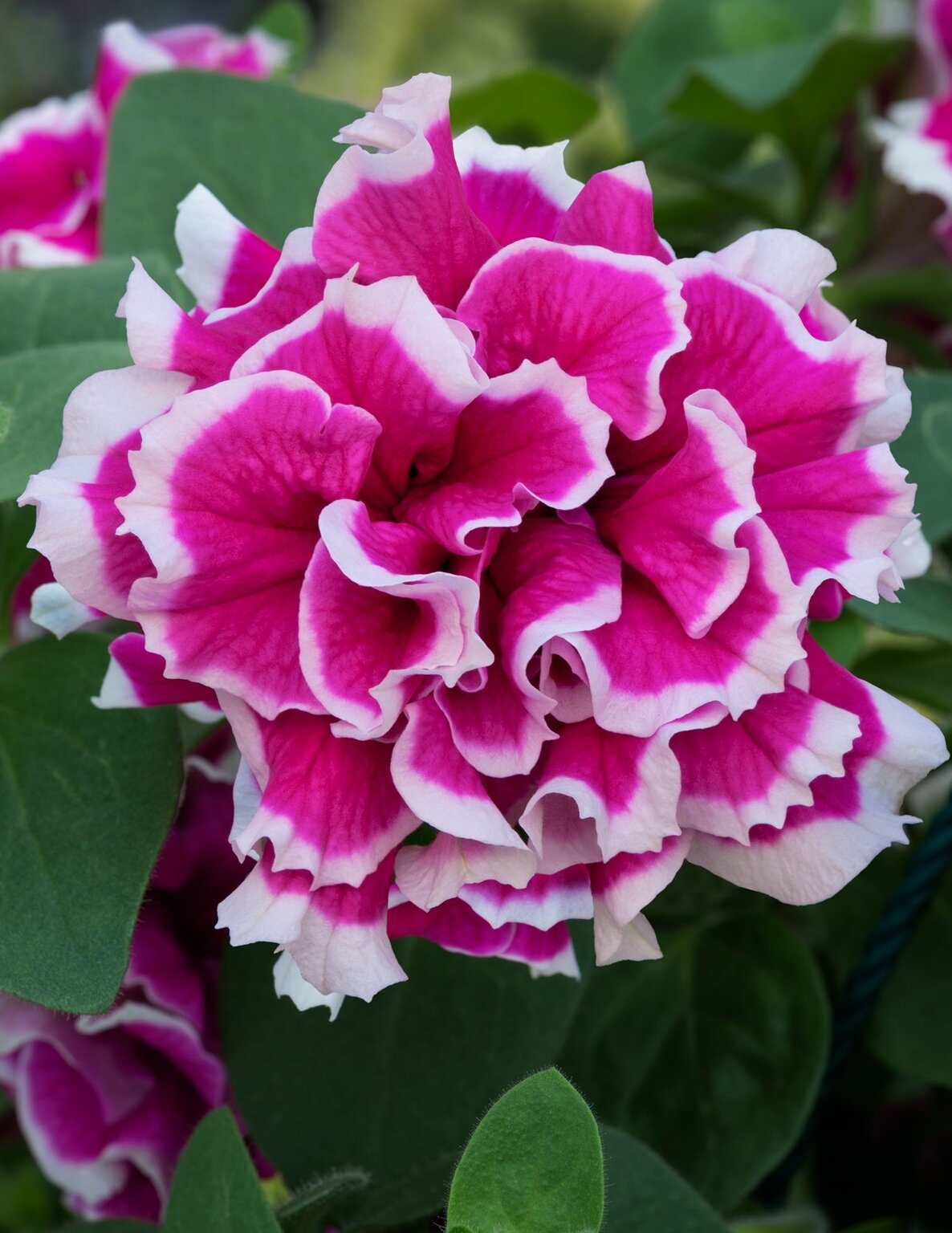 - A double flowering pink and white bi-coloured trailing petunia