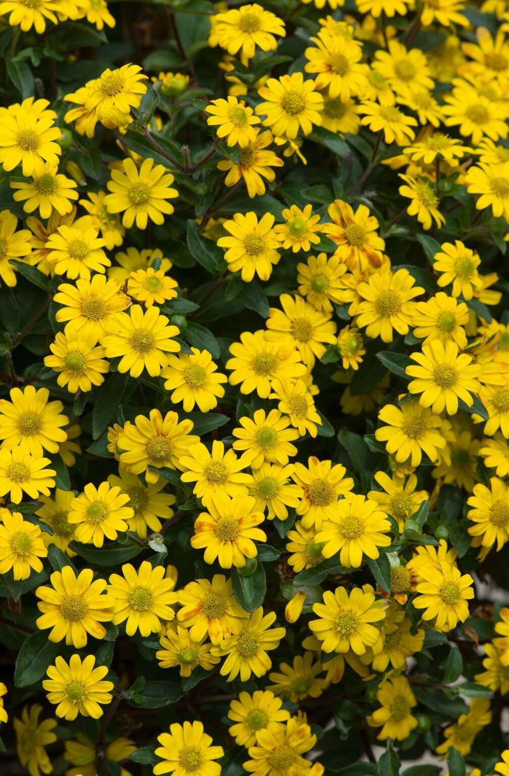 A trailing plant with bright golden yellow daisy flowers over mid green foliage