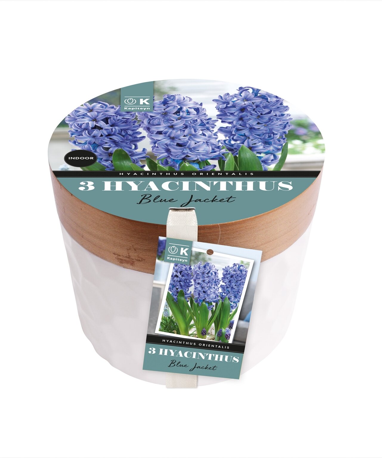 Attractive ceramic pot with 3 blue hyacinths and bulb compost