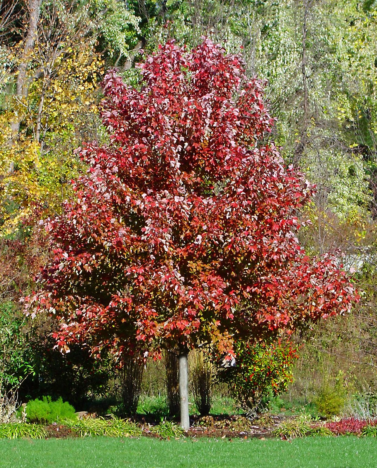 - A dense, round headed form that has glossy dark green leaves which are whitish beneath. They turn into stunning shades of scarlet red, orange and yellow in the autumn; holding on to its leaves quite late.