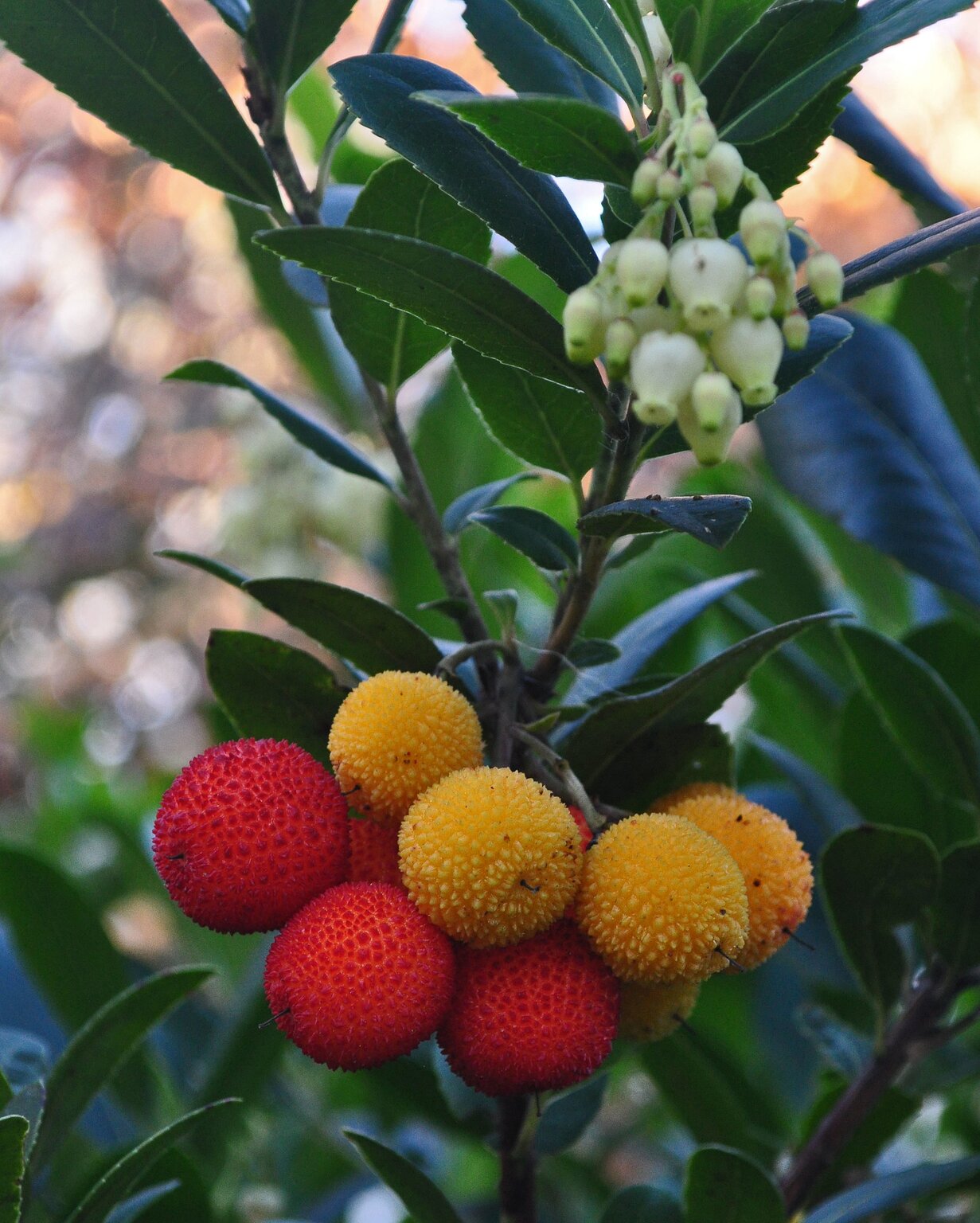 - ‘Urn-shaped’ white flowers and red strawberry-like fruits produce simultaneously in late autumn