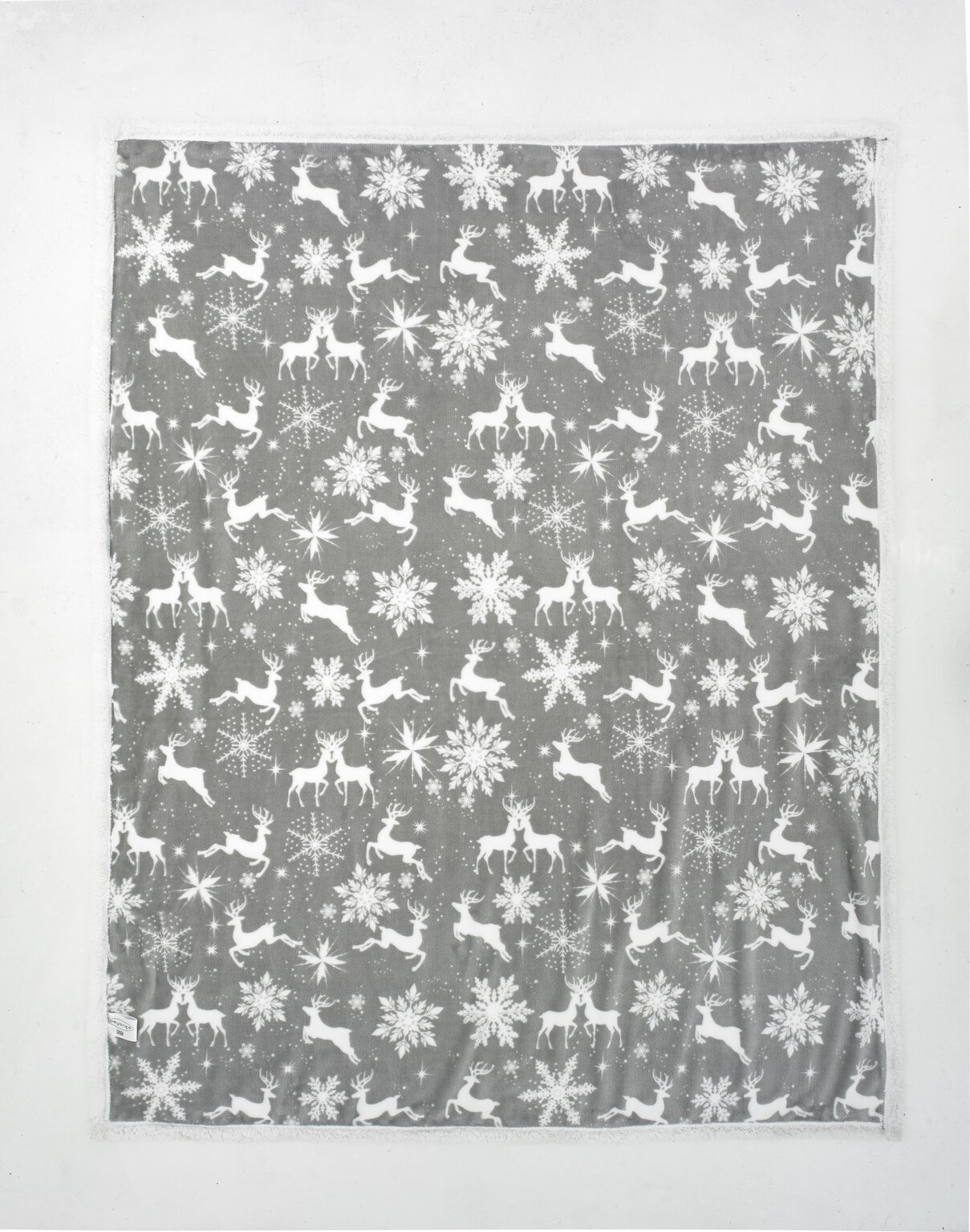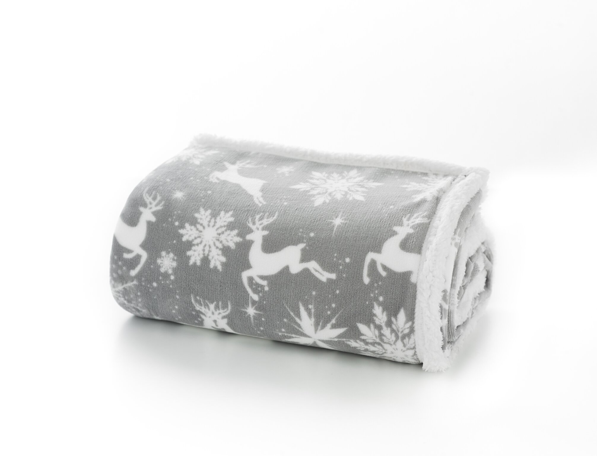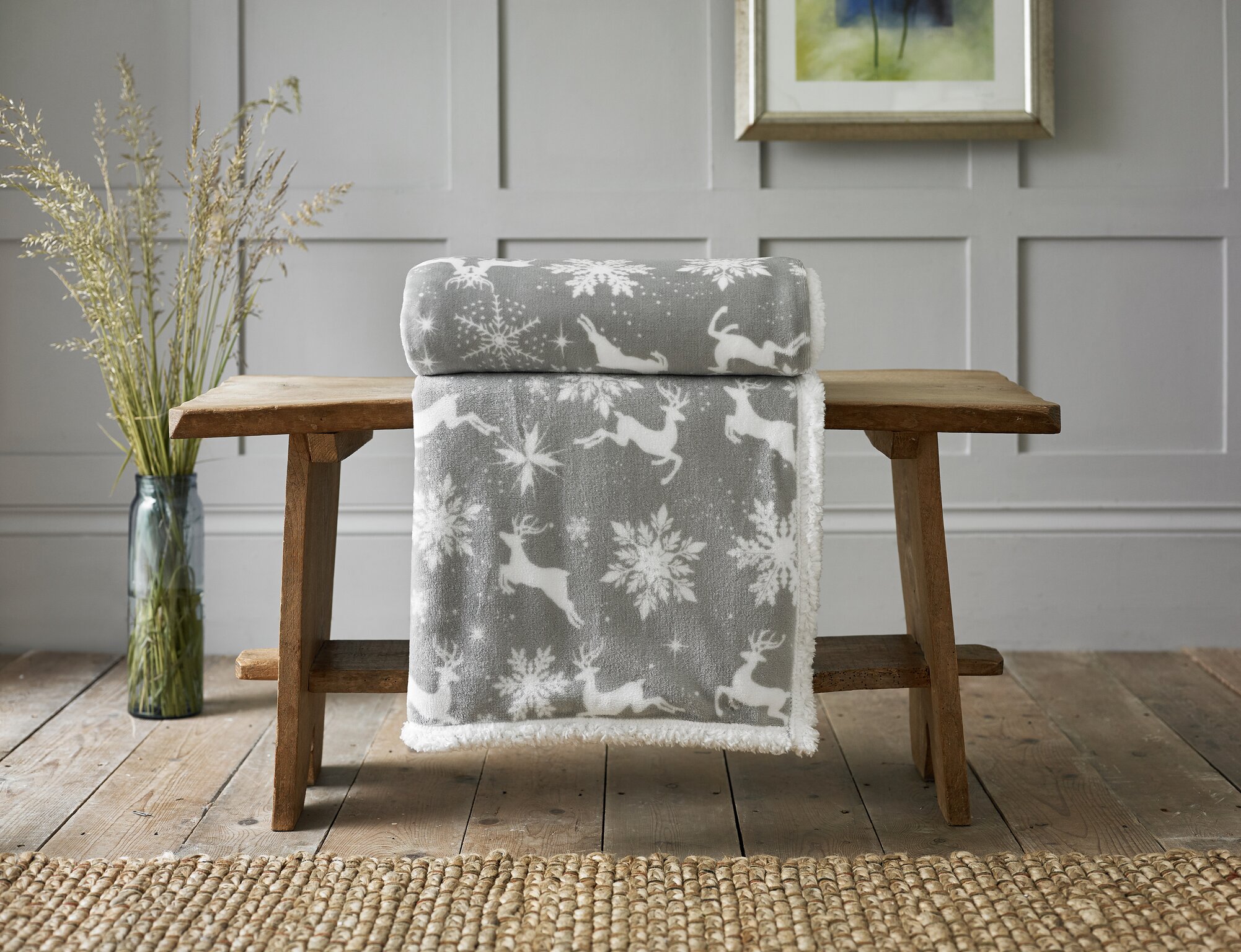The Deyongs Harts Throw (125 x 150cm) is a cosy and elegant fleece blanket perfect for adding warmth and festive charm to your home. Featuring a soft silver-grey background decorated with white reindeer, snowflakes, and stars, it evokes the peaceful spirit of winter. The reverse is lined with plush white Sherpa fleece, providing extra comfort and warmth. Made from 100% polyester, this lightweight throw is machine washable and tumble dry safe for easy care. Ideal for draping over sofas or beds, it’s a stylish and practical addition to any living space during the colder months.