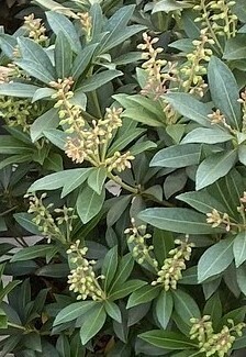 - Attractive evergreen shrub bears crowded panicles of urn-shaped, ivory-white flowers from March to May. The drooping blooms contrast well against a flush of copper coloured foliage which slowly matures to green throughout the summer.