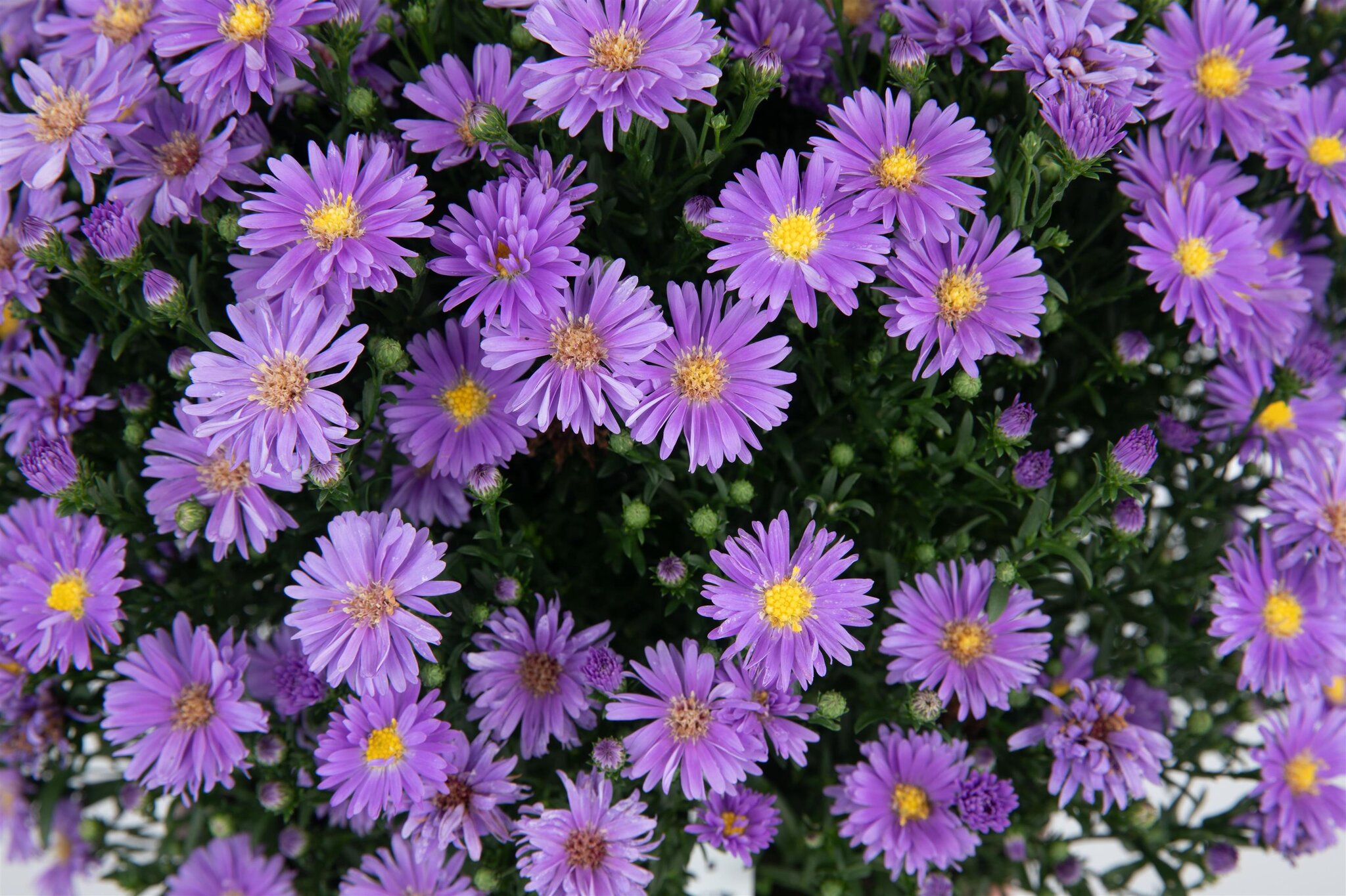 - Masses of vivid blue/purple flowers with a yellow centres cover the plant throughout the late summer and the autumn