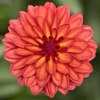 A decorative type dahlia, that produces large, long lasting orange/pink flowers