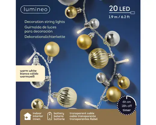Add a touch of sparkle to your festive décor with Lumineo’s LED Lights featuring shatterproof baubles in elegant silver and gold. The 20 warm white LEDs on a transparent cable create a delicate, twinkling effect that looks stunning on Christmas trees, garlands, wreaths, or mantelpieces.
