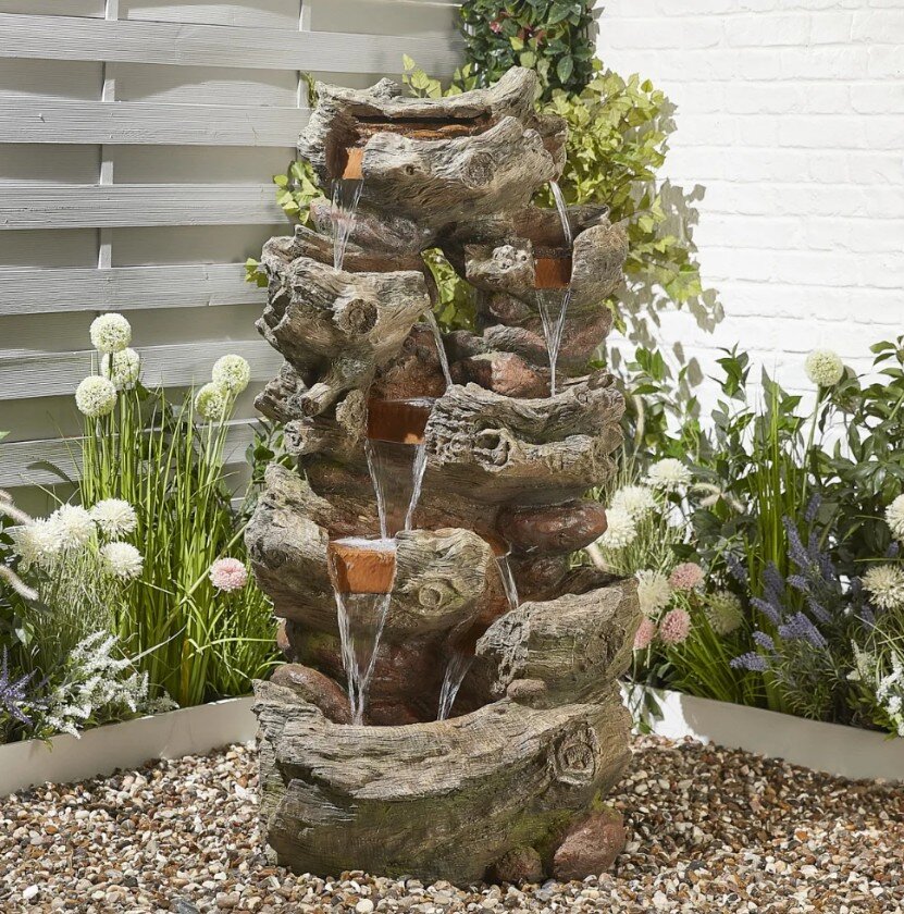 - A cascading, hollowed out tree design with 8 pouring waterfall sections