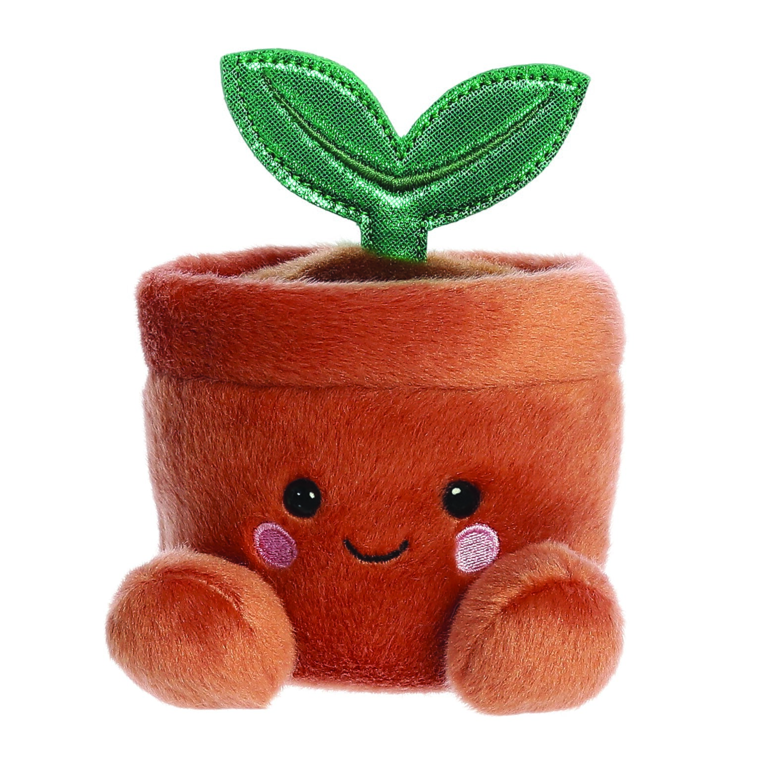 Introducing the delightful Terra Potted Plant from the Palm Pals collection. This charming plush features a soft brown pot with a vibrant green sprout emerging from the top, complete with a green leaf and a cheerful embroidered face. Designed to fit perfectly in the palm of your hand, Terra is both huggable and portable, making her an ideal companion for all ages.