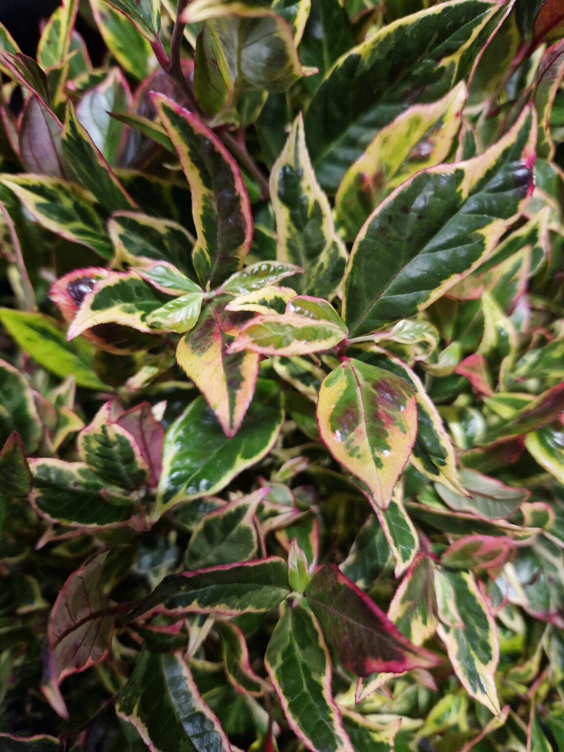 - An evergreen shrub with glossy green, red and white foliage and small fragrant white flowers in the spring