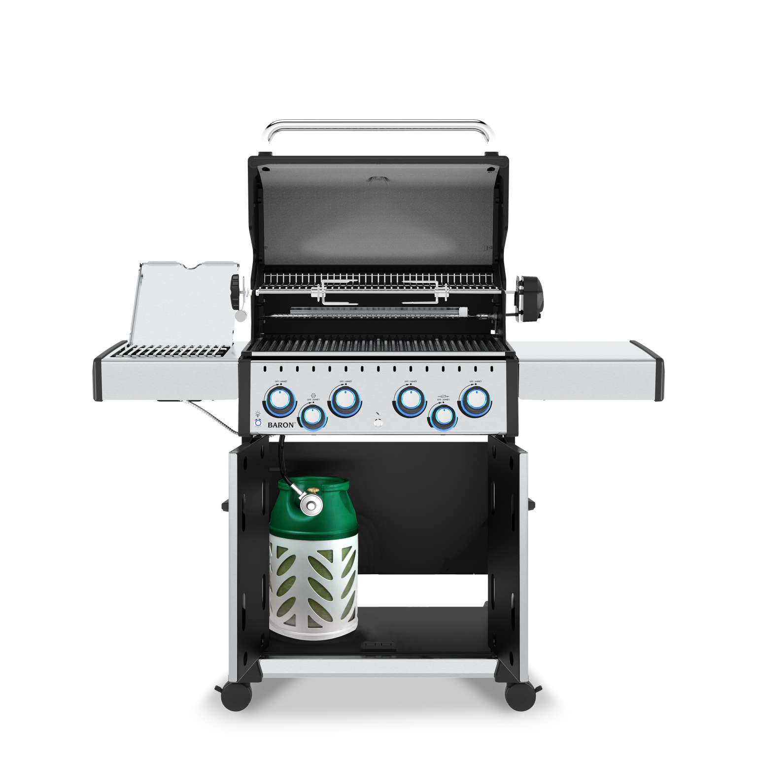 With four Dual‑Tube™ stainless‑steel burners producing around 12.4 kW of main heat, the Baron S490 IR ensures even cooking across its 2,864 cm² primary cooking area and 4,155 cm² total cooking space — ideal for steaks, burgers, vegetables and more. The infrared side burner offers intense searing power for perfect crusts, while the 4.4 kW stainless‑steel rear rotisserie burner and included premium rotisserie kit expand your options to succulent roasts and slow‑cooked favourites.