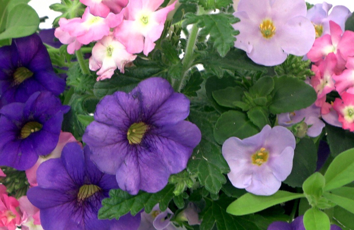 - A pretty mix of blue calibrachoa, blue bacopa and pink verbena