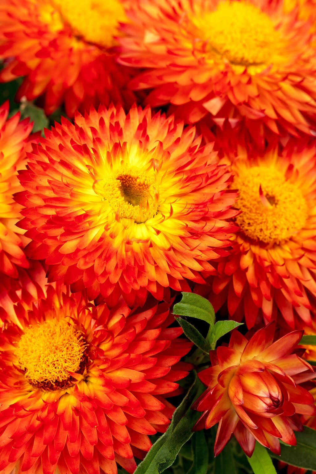 - Masses of round fluffy looking red and yellow bi-coloured flower heads that have a paper like feel