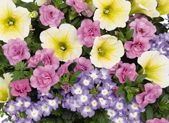 - A pretty mix of blue and white verbena, yellow and white petunia and light pink double calibrachoa