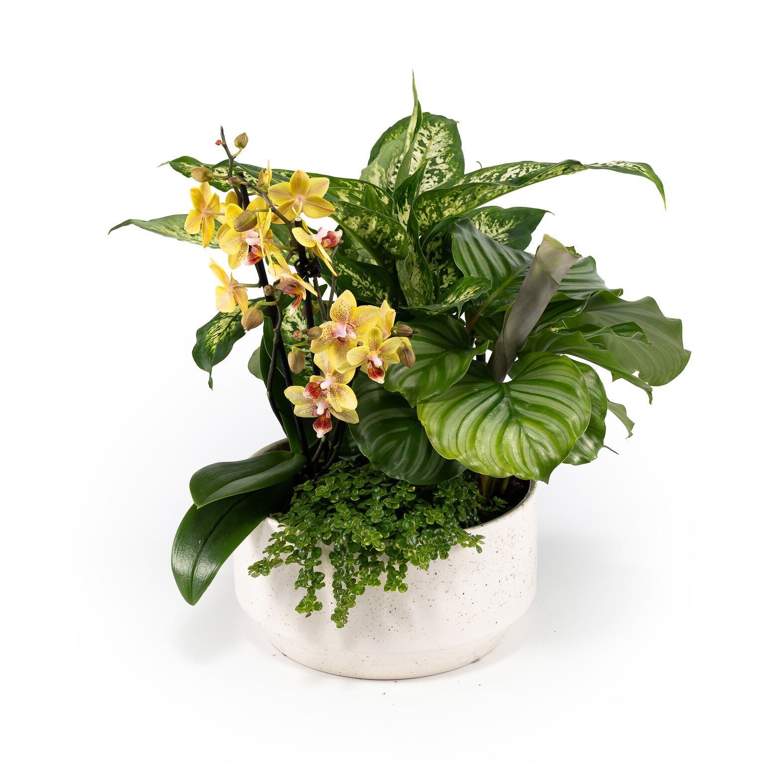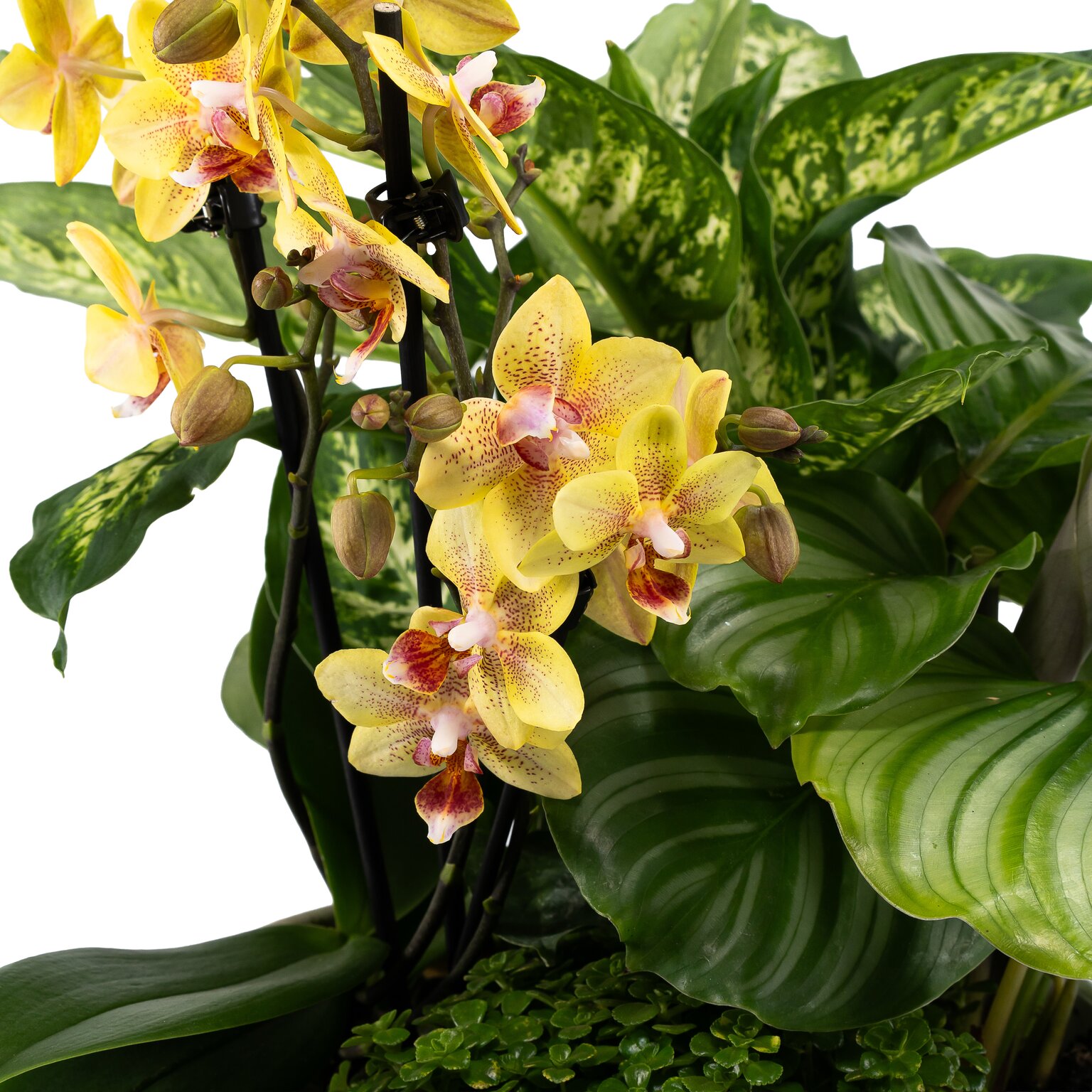 Planted in a generous 23cm container, this ready-made display delivers instant impact, making it ideal for coffee tables, sideboards or office environments. Mixed foliage arrangements are a popular choice for modern home décor, combining structure and softness to suit both contemporary and classic interiors. Larger planters like this also allow roots more space to thrive, supporting healthier, longer-lasting plants.