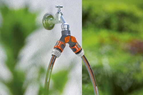 With the use of the GARDENA Twin-Tap Connector, two connections can be made to one tap. In this manner, two hoses can be secured to one tap without troublesome exchanging.