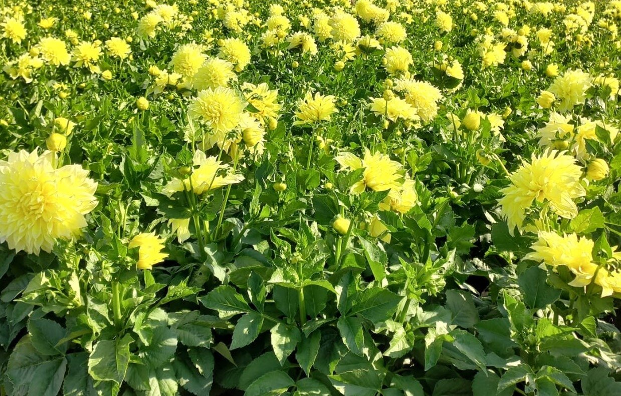 - Huge double bright yellow flowers that sit on slender stems above simple green foliage